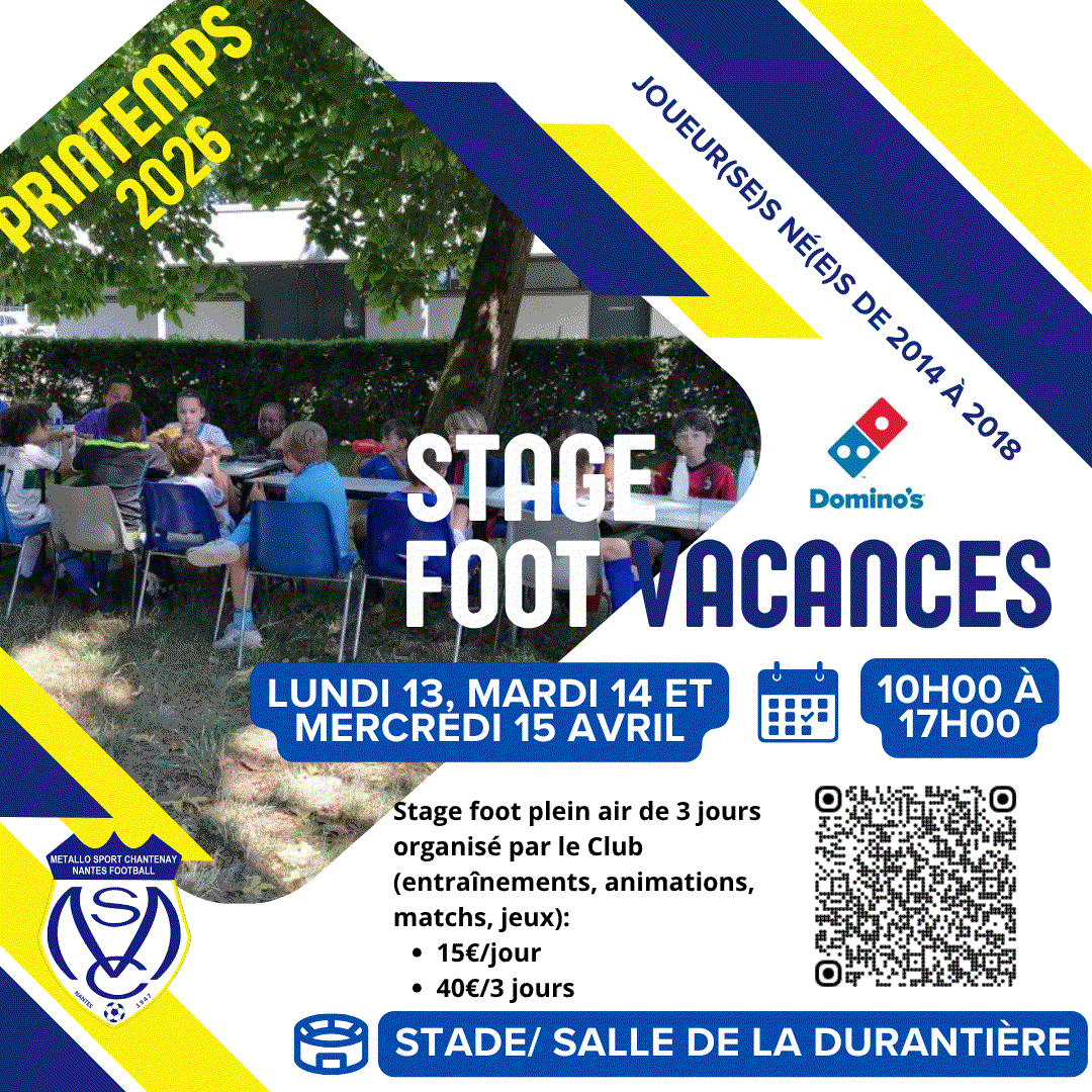Les joueurs et joueuses de U9 à U13 (licenciés au Club ou non) peuvent dès maintenant s'inscrire via HelloAsso (Qr Code) pour le stage de printemps les 3 premiers jours de la Première semaine des vacances.